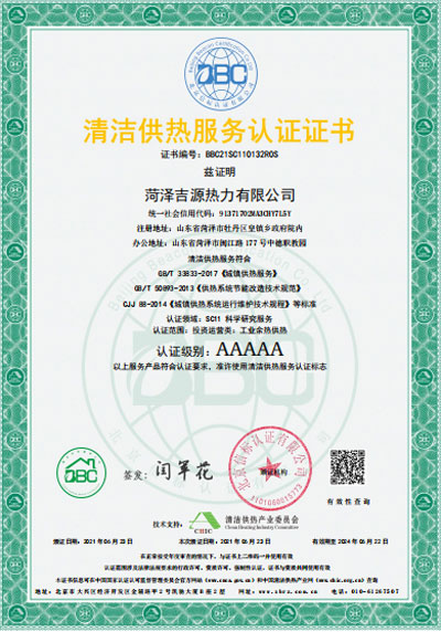 2021年6月23日,荣获5A级清洁供热服务认证。